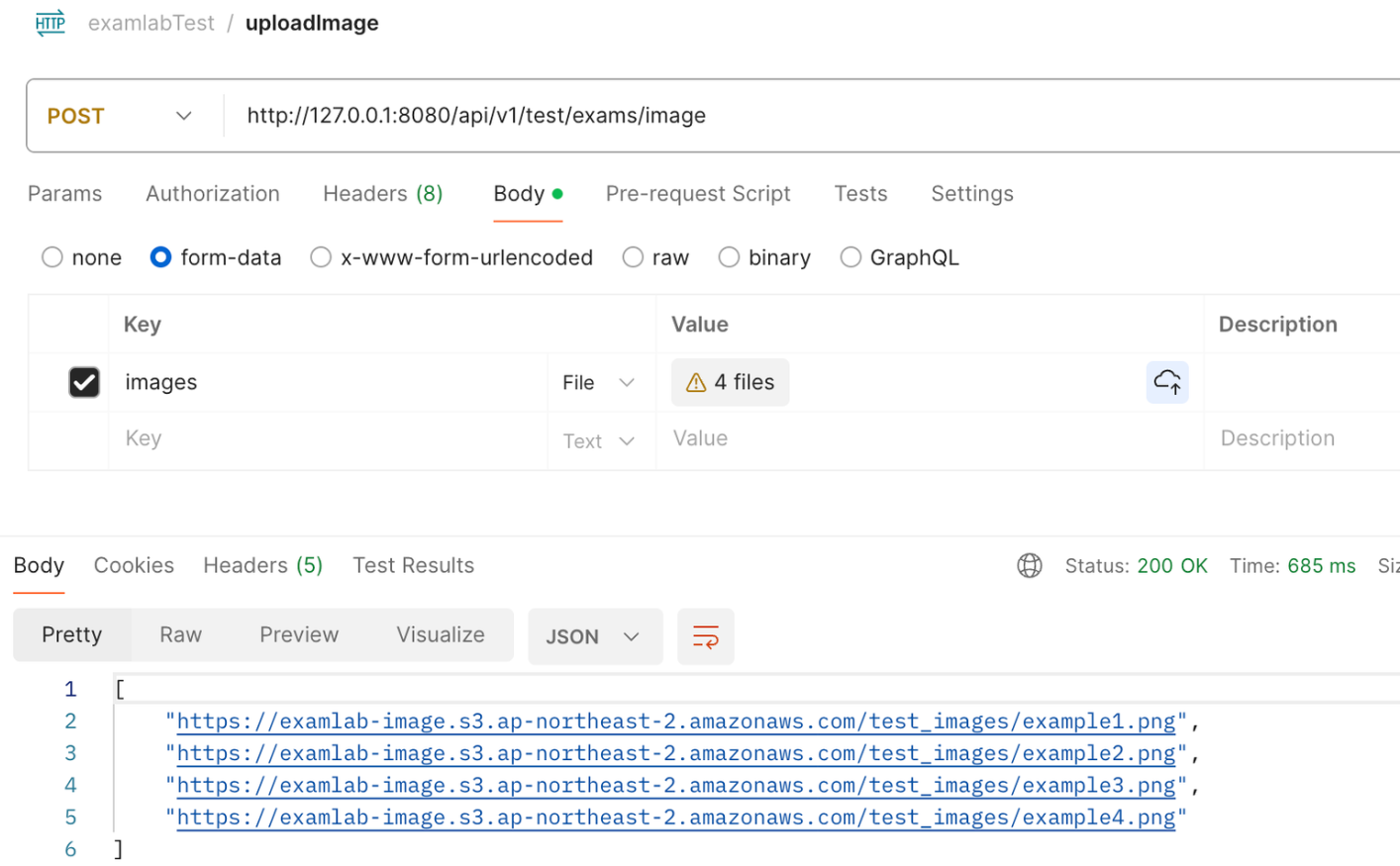 테스트를 위해서 스프링 실행 후 Postman에 이미지 4개 첨부 및 실행을 해본다. 그러면 다음과 같이 저장된 이미지의 url과 함께