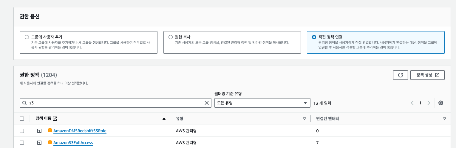- 권한 설정에서 AmazonS3FullAccess 추가
