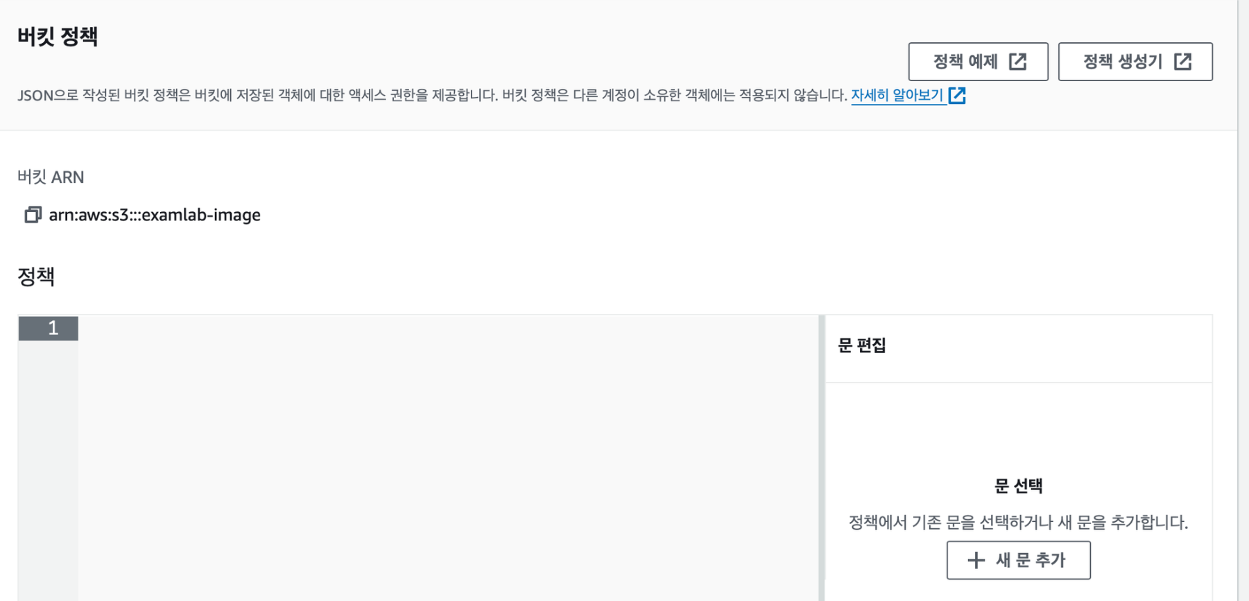 - 정책 생성기를 통해 생성된 코드를 아래 버킷 정책 페이지로 돌아와서 붙여준다