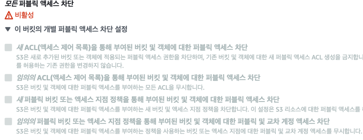 - 버킷 정책 변경을 위해서 퍼블릭 액세스 비활성화