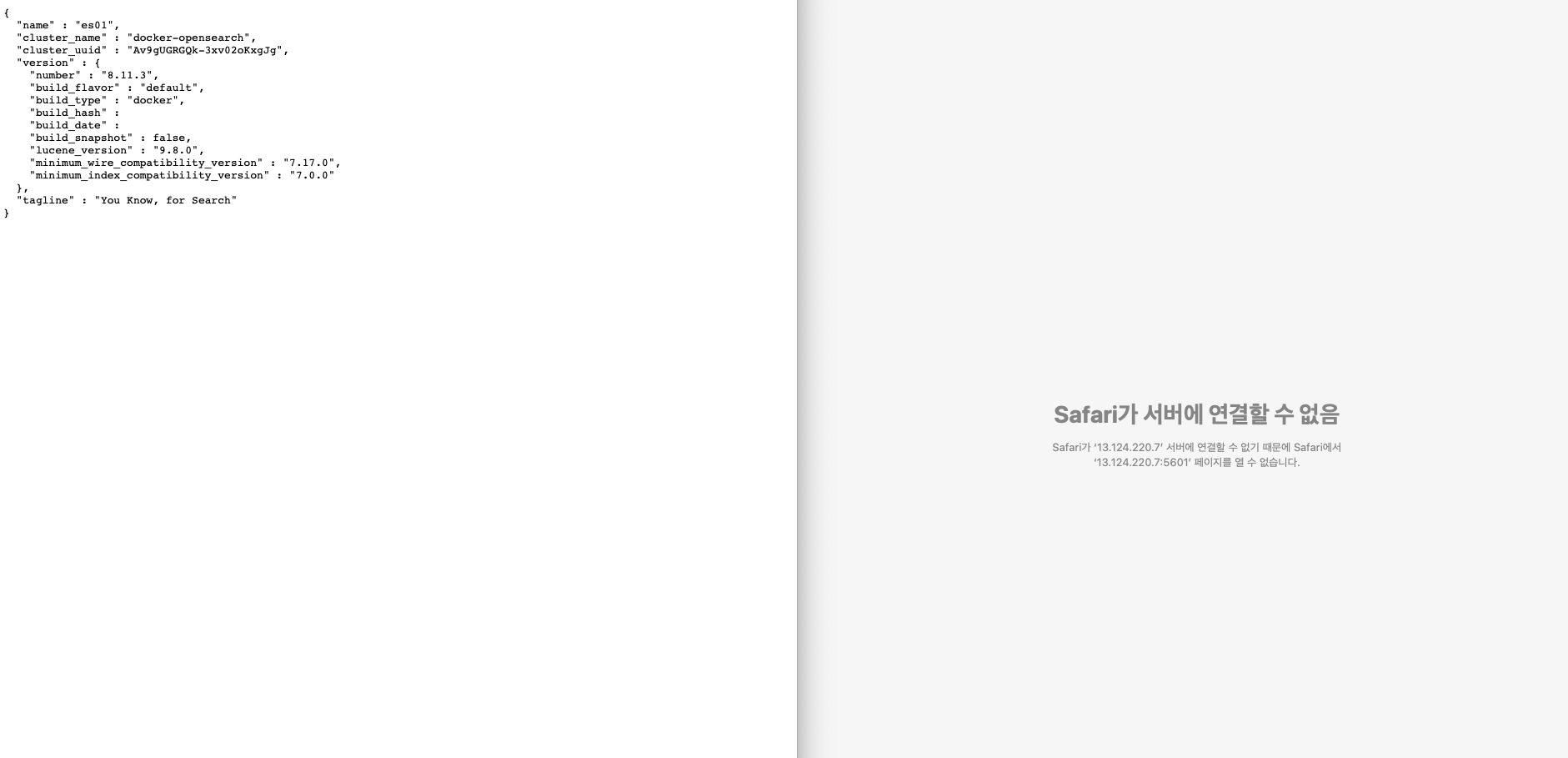 - 결론적으로 Docker compose.yml 파일에서 노드 3개를 생성하는 대신 노드 1개와 Kibana 조합으로 생성하여 작동 시켰습니다.