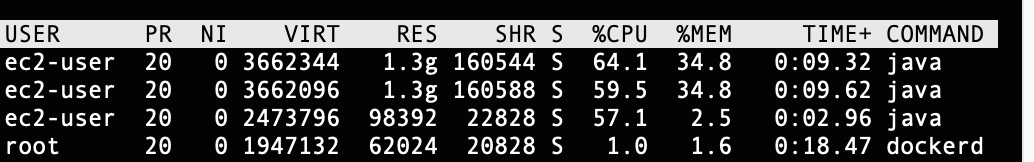 테스트를 진행할 때는 top 명령어를 이용하여 서버의 메모리 할당 상태를 모니터링하고, 동시에 Docker Elasticsearch 노드의 로그를 분석하여 테스트를 진행했습니다. 이를 통해 각 단계에서의 메모리 사용량과 서버의 상태를 확인하고 최적의 구성을 찾았습니다