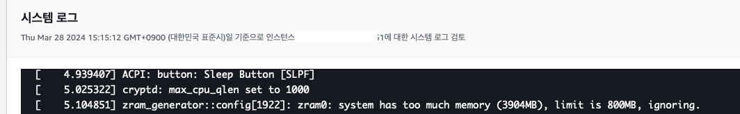- Aws 홈페이지에서 볼 수 있는 ec2 log를 통해 확인했습니다