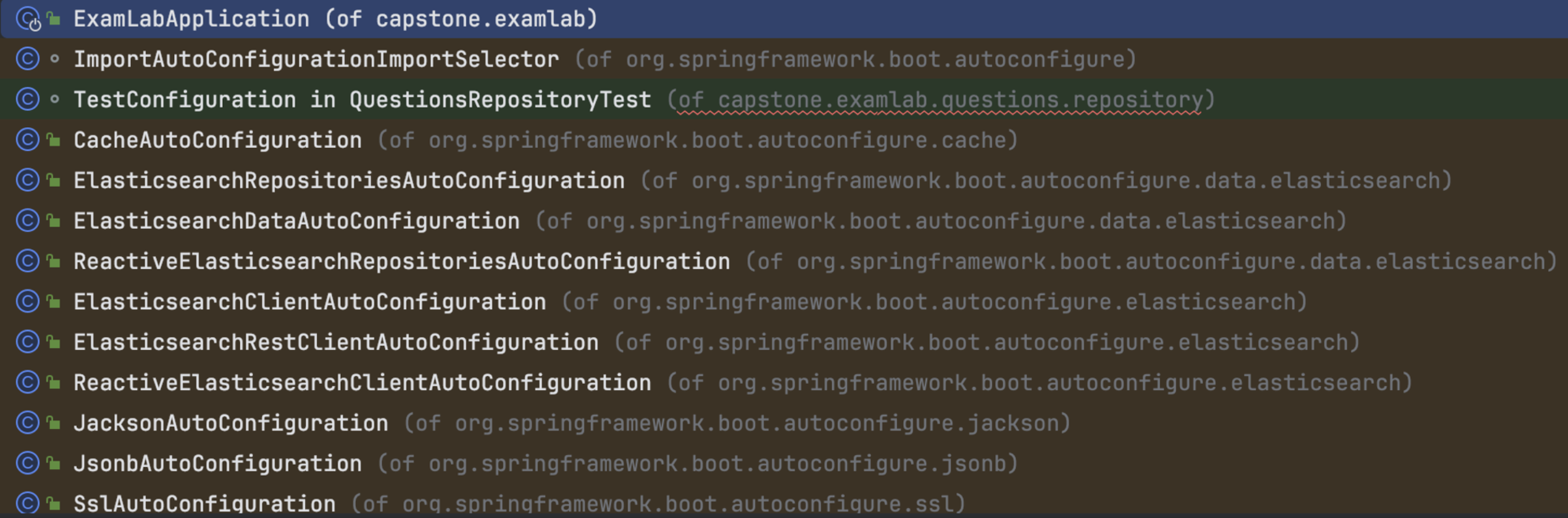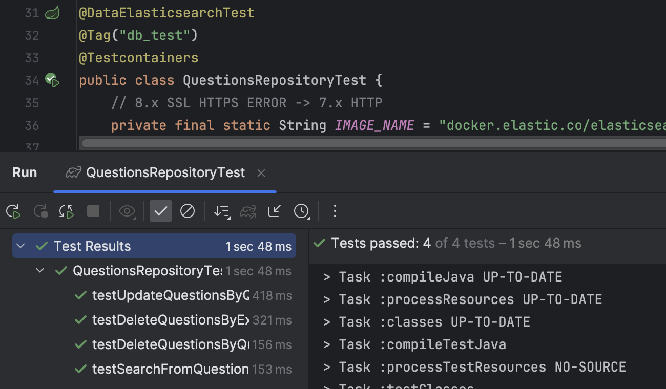 public interface QuestionsRepository extends ElasticsearchRepository<QuestionEntity, String> - 저의 경우 복잡한 쿼리 사용을 위해 BoolQueryBuilder 빈 등록과 데이터 조회 등록을 위해 ElasticsearchTemplate를 사용했으므로 각각 MockBean, Autowired시켜줍니다.