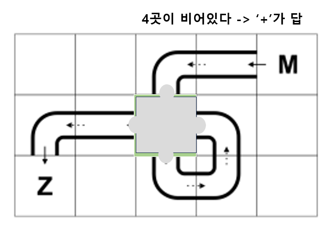 이후에 연결된 통로가 0개면 continue; 4개면 '+' 2개라면 해당 방향에 따라서 '|', '-', '1, ',2', '3', '4' 중에 선택해서 넣으면 된다. 추가로 M과 Z근처의 블록이 지워졌을 수도 있다. 이럴경우 연결된 통로가 1이거나 3이기때문에 이런 홀수 처리도 진행해야한다.