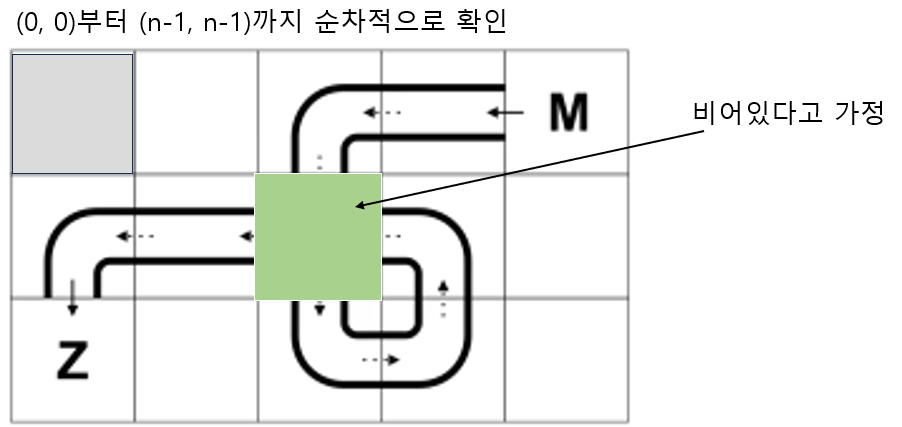 - 예외케이스로 Z또는 M에 연결된 가스관은 1개 또는 3개 방향에서 연결 시도를 한다. 이를 고려해서 (0,0)부터 (n-1, n-1)까지 순차적으로 확인하는데 주변에 해당 블록으로 방향이 되어있는 가스관이 없다면 다음 블록검증으로 넘어간다.