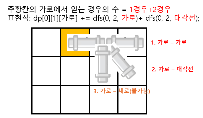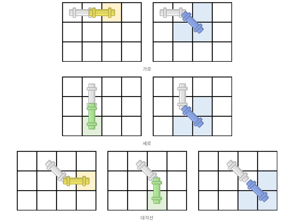 파이프가 가로로 놓여진 경우에 가능한 이동 방법은 총 2가지, 세로로 놓여진 경우에는 2가지, 대각선 방향으로 놓여진 경우에는 3가지가 있다.