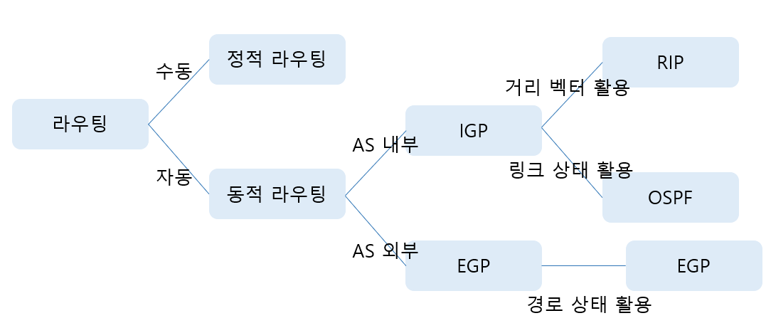 - (동적)라우팅 프로토콜: 라우터끼리 서로의 정보교환하는 프로토콜