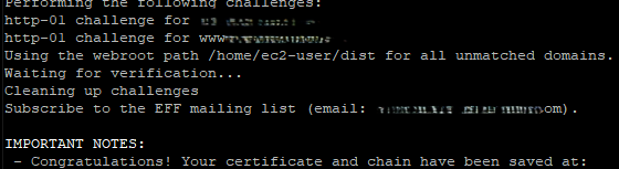 sudo certbot certonly --webroot -w /home/ec2-user/dist -d yourdomain.com -d www.yourdomain.com+