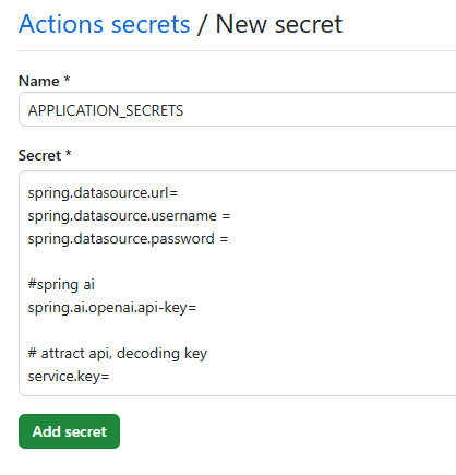 - secret.properties 방식: 아래와 같이 Repository Secret에 Key-Value형태로 추가 - 이 방법으로 진행)
