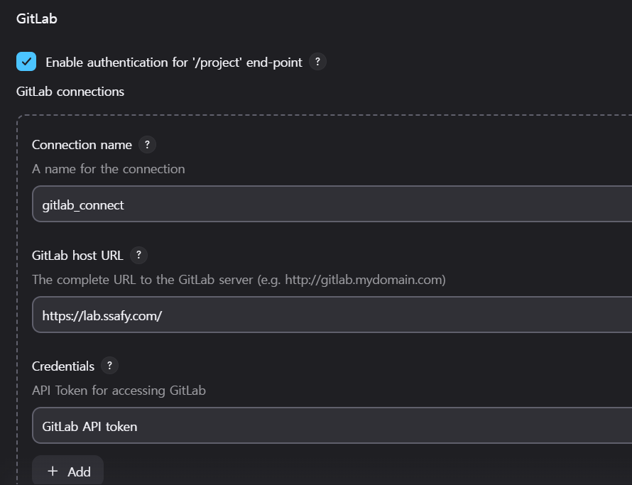 3. 발급된 토큰 기반으로 아래와 같이 jenkins에 jenkins 관리 - system에서 하단 gitlab쪽 아래와 같이 작성