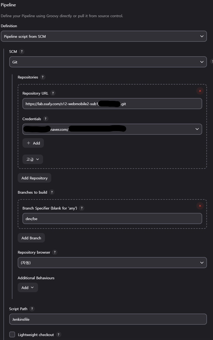 - Credentials: 미리 등록한 Username wwith password 넣어주기