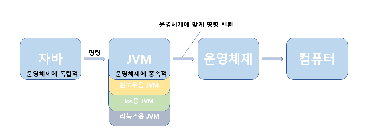 - JVM의미: Java Virtual Machine의 줄임말이며 자바 가상 컴퓨터정도로 이해하면 편하다.