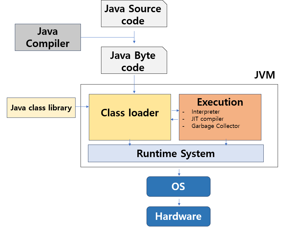 - 이후 저장된 메서드가 호출될때마다 해석하는것을 방지한다. - 공부하다 보니 문득 궁금한게 생겼다. JVM구성요소를 보면 인터프리터와 JIT 컴파일러가 공존하는것을 볼 수 있다. 기존 인터프리터 방식의 단점을 보안한 컴파일러면 인터프리터가 필요없는것이 아닌가?