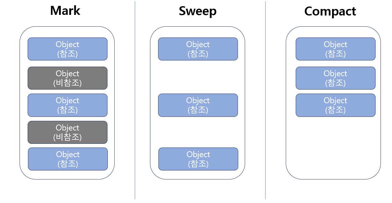 - Mark과정: 그래프 순회를 통해 어떤 객체 참조하고 있는지 찾아서 마킹
