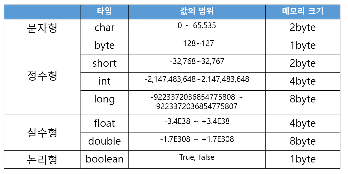 - 자바에는 총 8가지의 프리미티브 타입이있다.