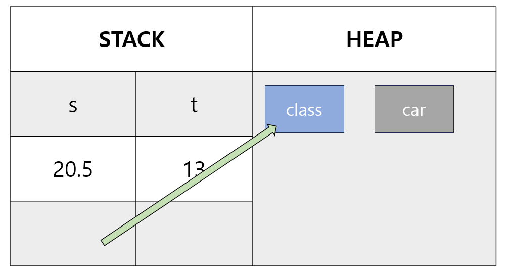 ※별도의 내용: 이제 저번 게시글에서 언급했던 가비지 컬렉터 내용 얘기를 꺼내보면 힙에서 참조받지 않은 객체를 삭제한다고 말했었는데 위에 그림을 예시로 들면 car이라는 객체가 참조되지않아 추후에 mark and sweep 과정에서 제거가 된다.