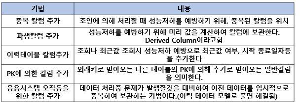 데이터베이스 성능 향상을 위하여, 데이터 중복을 허용하고 조인을 줄이는 방법이다.