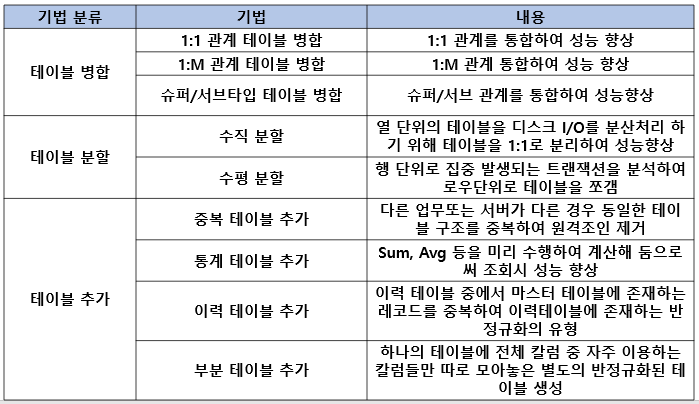 - 용량과 트랜잭션의 유형에 따라 반정규화 수행한다.