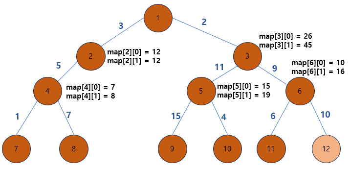 6같은 경우는 좌우중 12번이 가중치 더 크므로 map[6][0] = 10, 합은 map[6][1] = 6+11 = 16