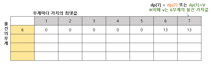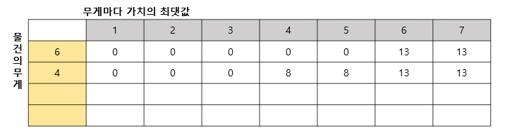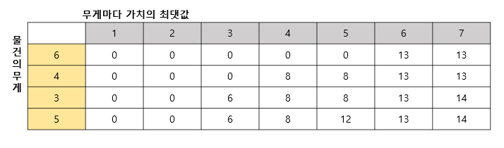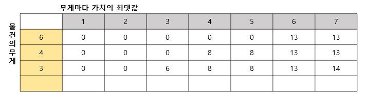 이 문제는 물품과 가치가 들어올때마다 0~K(버틸수있는 무게)무게에 따른 가치합의 최댓값을 계속 초기화시켜줘야한다. 아래 예시처럼 물품의 수가 4개이고 준서가 버틸수있는무게가 7이면우리는 물품이 들어올때마다 무게 1인경우, 2인 경우, ... 7인경우 매번 초기화를 시켜줘야한다.그럼 초기화시키는 기준은 어떻게 될지가 고민포인트인데 예시를 들어보겠다.무게 6과 4인 물품이 들어오고 3의 물품이 들어올때 무게 4,5,6,7을 기존 무게와 들어온 물품의 무게를 뺀 인덱스에 물품의 가치를 더한값을 비교하면 된다.무게 4일때의 가치합의 최댓값은