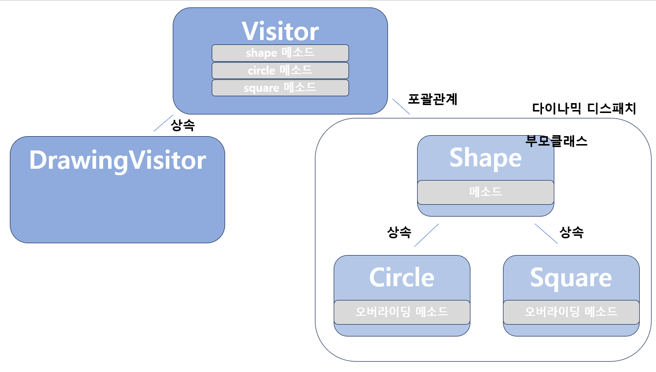 DrawingVisitor 클래스의 인스턴스는 Shape 클래스 중에서 먼저 Circle 클래스의 인스턴스를 받아서 그 안에 있는 메소드를 사용하고, 그 후에는 Square 클래스의 인스턴스를 받아서 그 안에 있는 메소드를 사용합니다