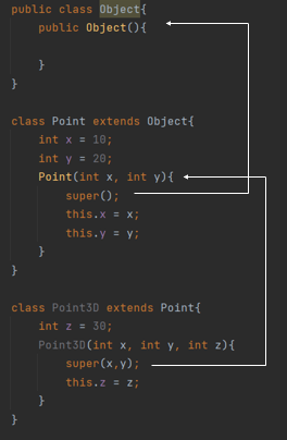 - Point3D() p3 = new Point3D(); 와 같이 인스턴스 생성하면 아래와 같은 순서로 생성자 호출