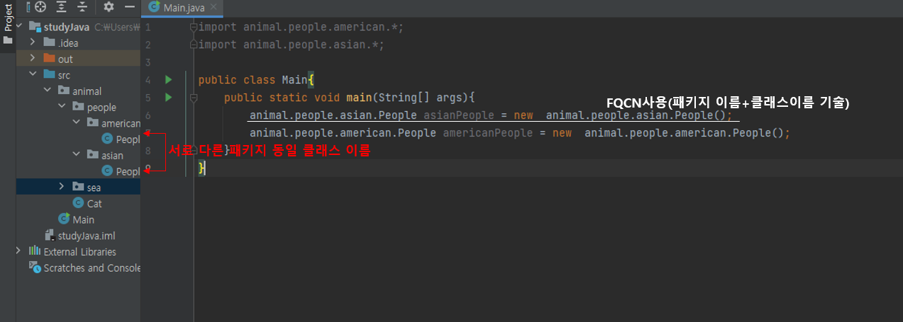만일 두개의 패키지가 다 import되어있고 각각의 클래스를 사용해야한다면 정확한 패키지 이름과 이름 전체를 기술해야한다