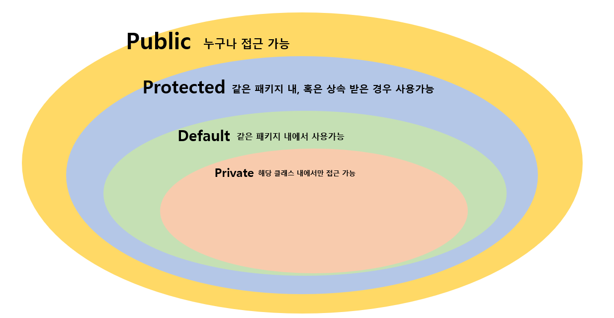 접근제어자: public, protected, default(지정 안되어있으면 자동 제어자), private