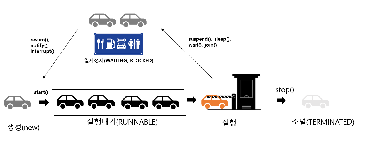 - resume: suspend()에 의해 일시정지상태에 있는 쓰레드를 실행대기 상태로 만든다