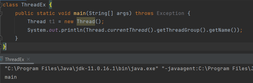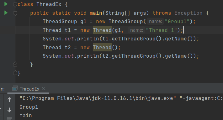 위에 코드를 보게되면 t1쓰레드는 그룹을 g1으로 설정해주어서 Group1에 포함되어있다고 뜬다. 하지만