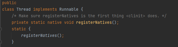 아래는 자바내에 정의된 Thread클래스의 코드다(Thread관련 메서드와 변수를 java.lang.Thread에서 제공). Runnable 인터페이스를 구현한 클래스 인 것을 알 수 있다.