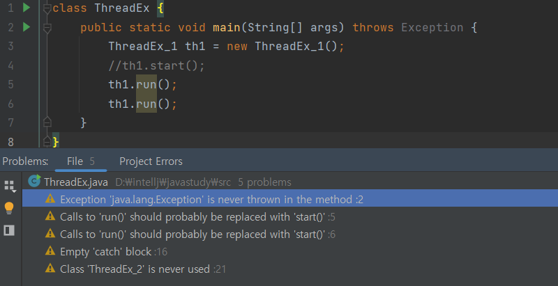 위에 코드가 작동되기는 하지만 아래 그림처럼 쓰레드가 새로 생성되고 작동하는것이 아니라 쓰레드 생성 없이 그냥 작동만 되는것이다.