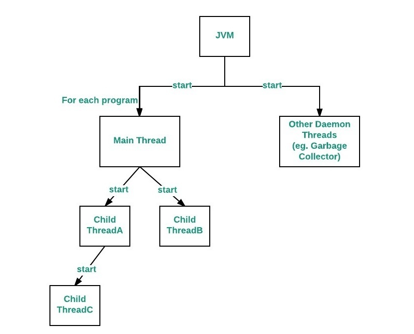 mian 메서드도 하나의 쓰레드이다. 이를 메인 쓰레드 라고 한다. 프로그램이 시작하면 가장 먼저 실행되는 쓰레드이며, 모든 쓰레드는 메인 쓰레드로부터 생성된다(아래그림 참고). 다른 쓰레드를 생성해서 실행하지 않으면, 메인 쓰레드가 종료되는 순간 프로그램도 종료된다. 하지만 여러 쓰레드를 실행하면, 메인쓰레드가 종료되어도 다른 쓰레드가 작업을 마칠때까지 프로그램이 종료되지 않는다. 쓰레드는 '사용자 쓰레드'와 '데몬 쓰레드'로 구분되는데, 실행 중인 사용자 쓰레드가 하나도 없을때 프로그램이 종료된다.