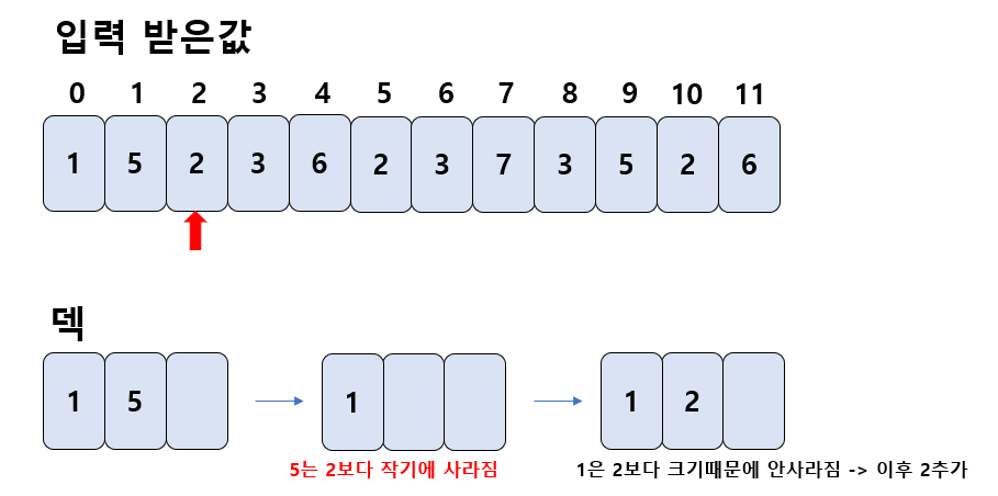 이제 새로 값이 들어왔을때 덱의 마지막값부터 시작해서 비교를 해나가는거다.