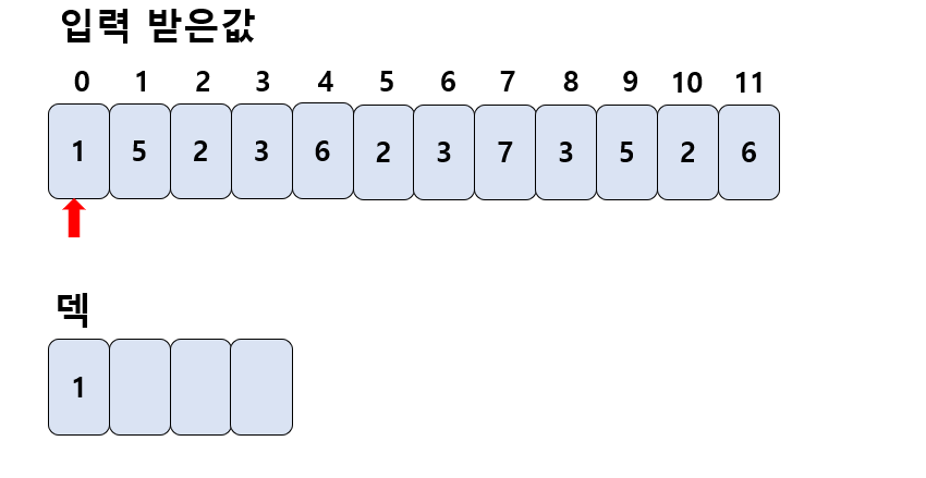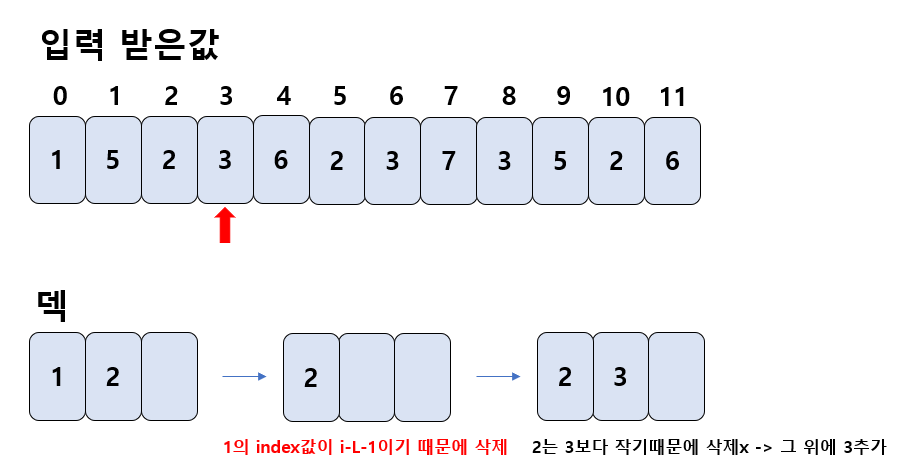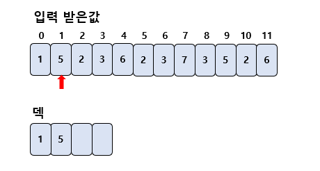 이제 새로 값이 들어왔을때 덱의 마지막값부터 시작해서 비교를 해나가는거다.