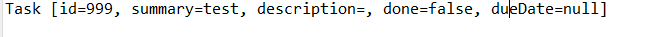 return "Task [id=" + id + ", summary=" + summary + ", description=" + description + ", done=" + done