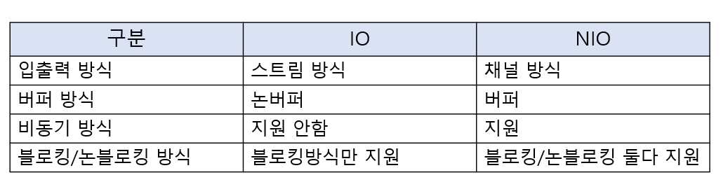 - 기존의 Stream은 blocking방식과 Non-Buffer의 특징으로 인해 입출력 속도가 느리다. ⇒ 자바 4부터 NIO(New Input Output)가 java.nio패키지에 포함되어 등장, Channerl이 그 NIO의 기본 입출력 방식이다.(buffer방식)