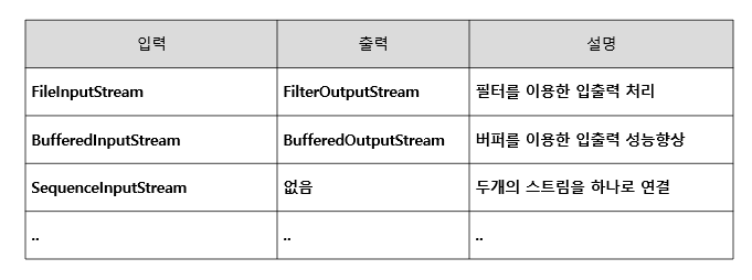 - 보조스트림은 자체적으로 입출력 수행불가이므로 생성할때 InputStream과 OutputStream 선언해줘야함