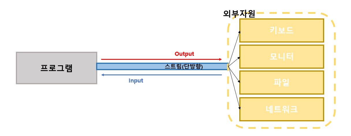 - 단방향: 입력, 출력 다안하고 하나만 가능하다(따라서 동시에 수행할려면 스트림이 2개 필요하다), 추가로 도달하는것은 큐를 생각하면 됨(선입선출)