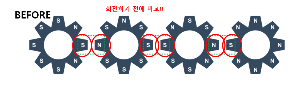 두 톱니바퀴의 맞닿은 부분은 초록색 점선으로 묶여있는 부분이다. 여기서, 3번 톱니바퀴를 반시계 방향으로 회전했다면, 4번 톱니바퀴는 시계 방향으로 회전하게 된다. 2번 톱니바퀴는 맞닿은 부분이 S극으로 서로 같기 때문에, 회전하지 않게 되고, 1번 톱니바퀴는 2번이 회전하지 않았기 때문에, 회전하지 않게 된다. 따라서, 아래 그림과 같은 모양을 만들게 된다.