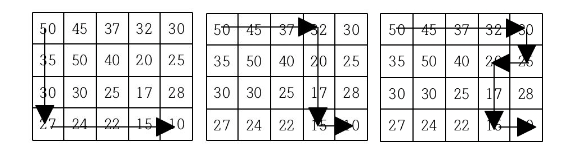 현재 제일 왼쪽 위 칸이 나타내는 지점에 있는 세준이는 제일 오른쪽 아래 칸이 나타내는 지점으로 가려고 한다. 그런데 가능한 힘을 적게 들이고 싶어 항상 높이가 더 낮은 지점으로만 이동하여 목표 지점까지 가고자 한다. 위와 같은 지도에서는 다음과 같은 세 가지 경로가 가능하다.
