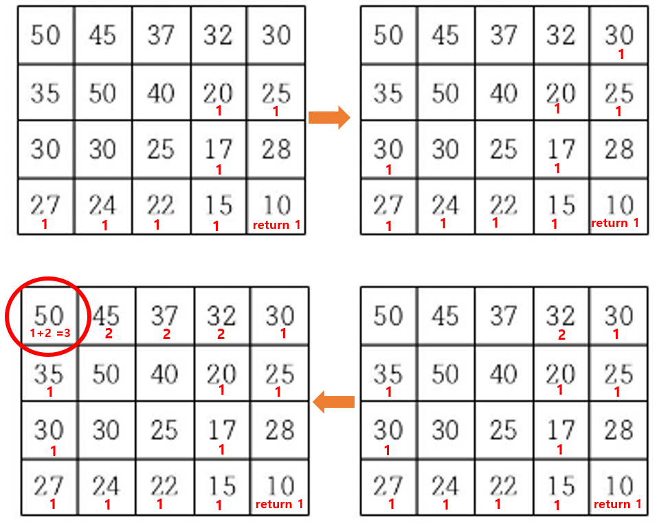 이런 과정을 거치고 최종적으로 생각한 방법은 m,n 칸에 도달하면 return 1을 주는 식으로 하고 각 칸은 상하좌우에 있는 본인보다 작은 값을 가진 칸의 경우의 수를 합하는 식으로 진행을 했다. 아래 그림을 통해 설명하겠다.