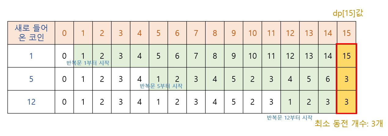 식은 dp[i] = 기존dp[i]의 값과 dp[i-새로들어온 동전 값어치]+1 의 값과 비교하여 더 낮은 값을 대입해주면 된다.