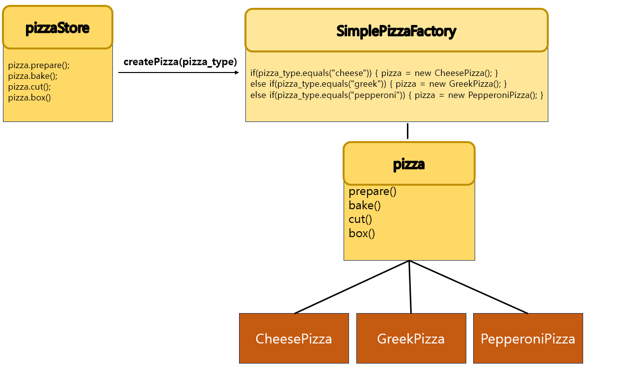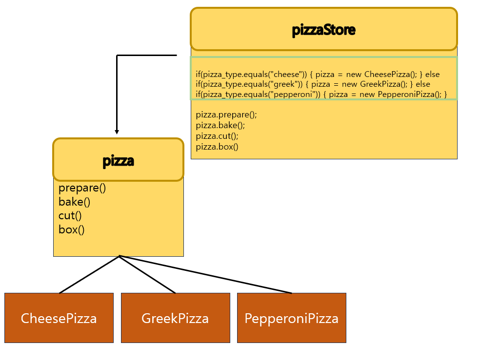 위 방식에서 피자 종류가 추가 된다고 생각을 해보자. 그러면 PizzaStore에서 else if문이 하나