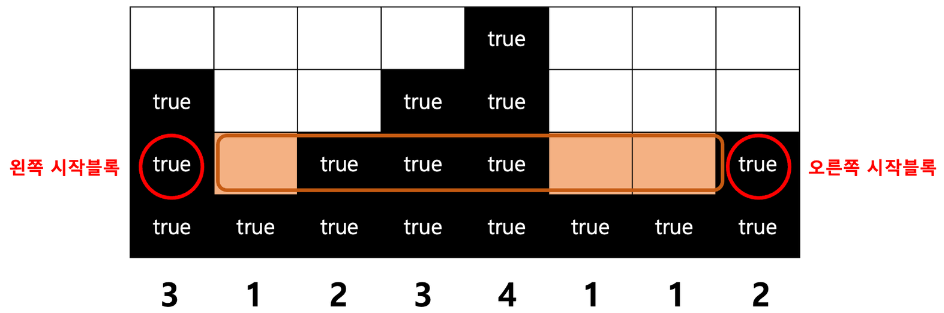 - 이후에 블록으로 표시된 곳은 true로 표시하고 모든 층을 반복문돌려서 해당층의 왼쪽 시작점과 오른쪽 시작점을 찾는 방식을 생각해봤다