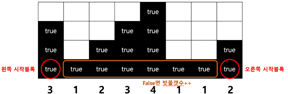 - 이후 조건에 맞게 왼쪽 시작점과 오른쪽 시작점을 찾으면 그 사이에 있는 방문하지않은 칸을 더해준다.(방문했다는것은 블록인칸 따라서 제외)