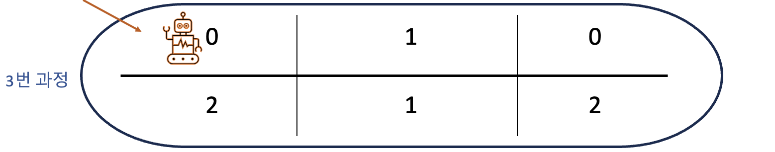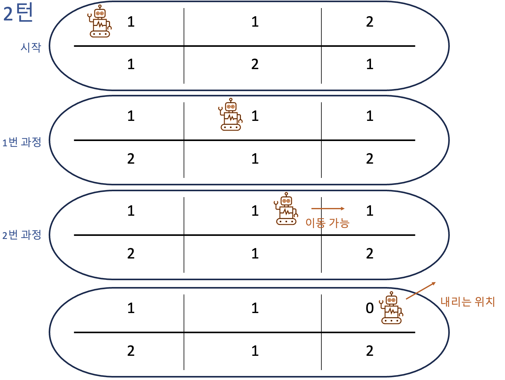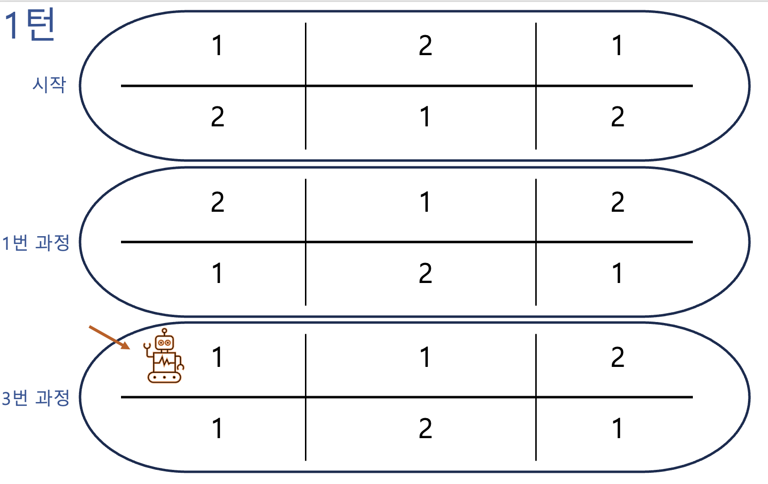 - 벨트가 각 칸 위에 있는 로봇과 함께 한 칸 회전한다.