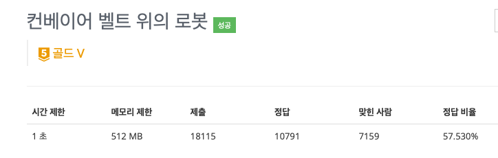 - 가장 먼저 벨트에 올라간 로봇부터, 벨트가 회전하는 방향으로 한 칸 이동할 수 있다면 이동한다. 만약 이동할 수 없다면 가만히 있는다.