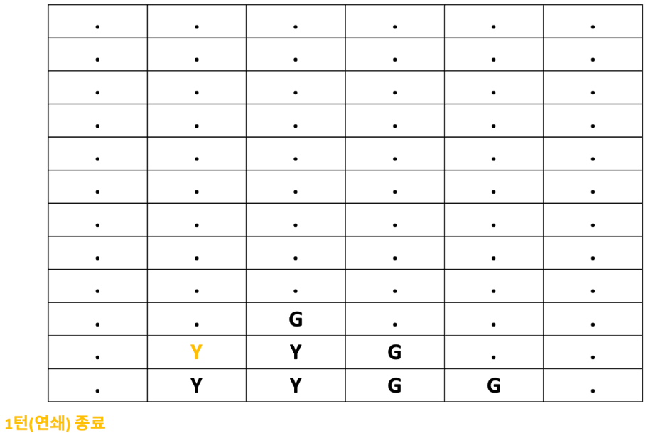 입력으로 주어지는 필드는 뿌요들이 전부 아래로 떨어진 뒤의 상태이다. 즉, 뿌요 아래에 빈 칸이 있는 경우는 없다.